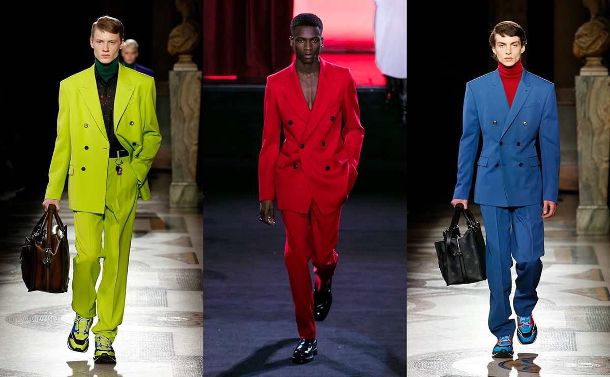 Vergessen Sie Nadelstreifen auf anthrazitfarbenem Hintergrund, für die Saison Herbst/Winter 2020/21 wird der Anzug in monochromatischen Farben, aber in auffälligen und theatralischen Tönen getragen. Die stilistische Übung wurde insbesondere von den Häusern Ami Paris und Berluti praktiziert.
