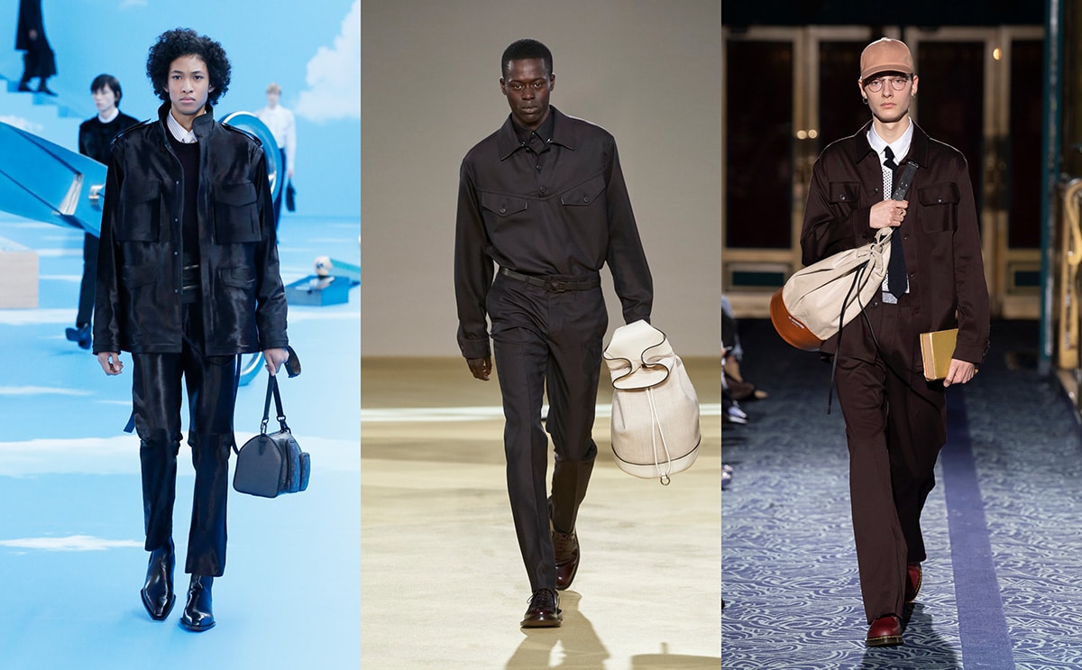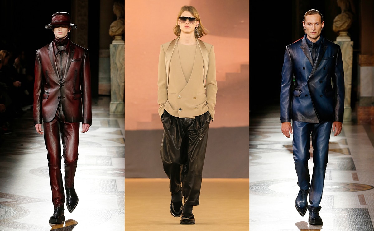 Leder und Lederersatz strukturieren Männeranzüge in einem Geist der Nonchalance oder des Abenteuers. Die Kollektion von Berluti für Herbst/Winter 2020/21 mit ihren patinierten Lederarten ist eine Ode an das Material.
