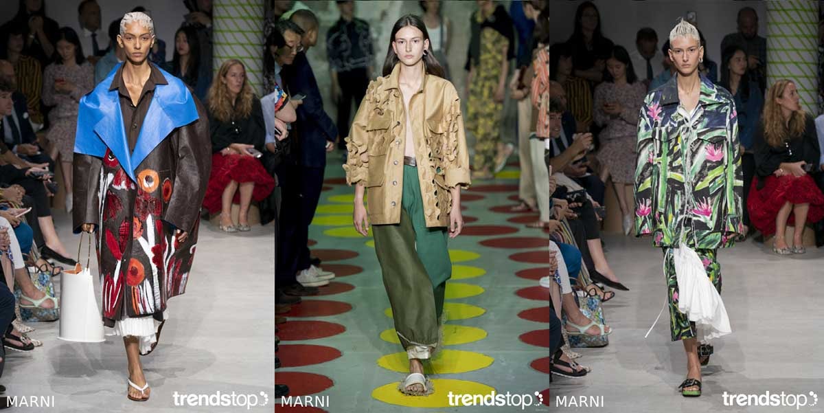 Im Anschluss an seine recycelte Herrenkollektion vom Juni setzte Marnis Francesco Risso das Thema fort, indem er die Kulisse der Vorveranstaltung neu nutzte und Reste aus dem Archiv für viele der ausgestellten Kleidungsstücke verwendete. Organische Stoffe, die drapiert und aufgebauscht wurden, verweisen auf das Leben im Meer, durchsetzt mit kräftigen, handbemalten Laubmotiven auf aussagekräftiger Oberbekleidung.