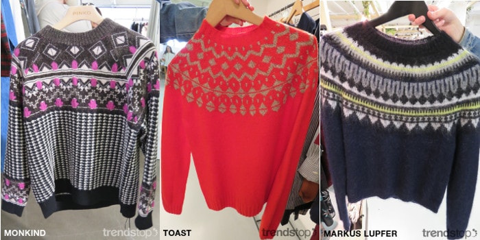 Strickbekleidung schaut zur Inspiration Richtung Skandinavien und gemütliche Pullover werden mit Platzierungsmustern im nordischen Stil verziert. Neutrale/Neon-Farbkombinationen modernisieren eine traditionelle folkloristische Geometrik, während flausche Kammgarne und superweiche Mohair-Strukturen grafische Motiver weicher machen.