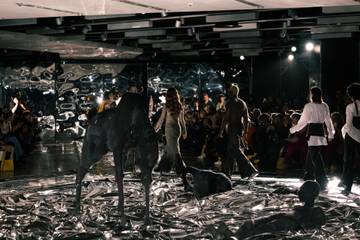 Noch knapper wurde es nur bei den Looks, die auf Micro-Tops setzen. Ganz im Sinn der wilden Berliner Clubs, bei denen auch gerne mal auf Kleidung verzichtet wird, wurden Glitzergürtel und Latex-Feder-Tubetops zum einzigen Stück Material auf dem Oberkörper. Olivia Ballard schickte derweil einen minimalistischen, aus Silberketten geflochtenen BH auf den Laufsteg.