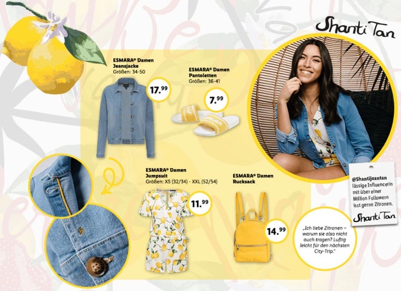 „Shantis Leidenschaft für Zitronen ist für ihre Follower längst kein Geheimnis mehr. Diese hat sie in ihr Esmara-Outfit integriert. Mit ihrem Jumpsuit (aus Viskose und Elasthan) in Wickeloptik und Zitronenprint ist sie mittags beim Stadtbummel perfekt gestylt. Abgerundet wird der Look durch Shantis Bade-Pantoletten in angesagter Frottee-Optik sowie durch ihren zitronengelben Rucksack. Cool kombiniert mit ihrer Jeansjacke (aus Baumwolle und Elasthan) ist Shantis Outfit perfekt“, heißt es bei Lidl über Shanti Joan Tans Outfit. Die Influencerin hat über eine Million Follower.