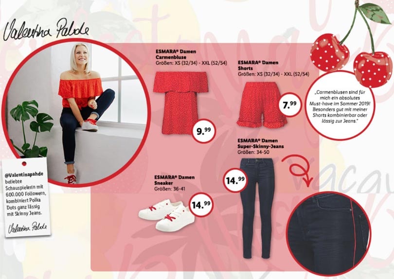 „Verspielt, trendy und dennoch sportlich: Valentinas Look ist vielseitig. Ihre rote Carmenbluse mit Polka Dots und Volants lässt sich ebenso gekonnt zur passenden Shorts (beides aus Viskose und Elasthan) kombinieren wie zu ihrer Super Skinny Fit Jeans (Stretch durch hohen Elasthan-Anteil) mit perfektem Sitz und roten Highlights. Weiße Sneakers mit wahlweise roten oder weißen Schnürsenkeln runden das Outfit ab“, wird Valentina Pahdes Outfit beschrieben. Die Schauspielerin hat 600.000 Follower.