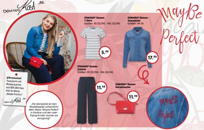 „Maritim kommt niemals aus der Mode. Kati kombiniert ihre marineblaue Culotte (aus Viskose und Elasthan) gekonnt mit einem weiß-blau gestreiften Basic-Shirt mit aufgedruckter Kirsche sowie dem Must-have des Jahres: der Gürteltasche. Knallrot mit goldenen Elementen setzt die Tasche den perfekten Akzent für den Gesamtlook und lässt sich ganz einfach zu einer Crossbody-Bag umfunktionieren. Für kühle Abende hat Kati ihre Jeansjacke (aus Baumwolle und Elasthan) mit ihrem eigenen Motto ‘Maybe perfect’ griffbereit“, so Lidl über das Outfit der Influencerin, die