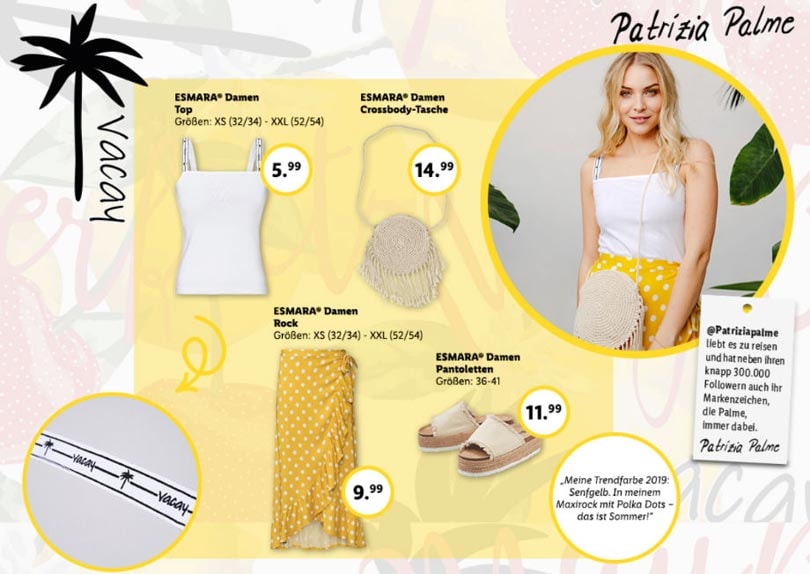 „Senfgelb darf in diesem Jahr in keinem Kleiderschrank fehlen. Passend dazu hat Patrizia das Trendpiece Maxirock (aus Viskose und Elasthan) in dieser Farbe entworfen und mit weißen Polka Dots und Volants aufgepeppt. Die Influencerin kombiniert dazu ein klassisch-weißes, gerade geschnittenes Trägertop (aus Baumwolle und Elasthan) mit Palmenverzierungen und ihre Pantoletten mit leichtem Plateau. Weiter aufgelockert wird der Style mit der aufwendig geknüpften Crossbody-Bag mit Fransen (aus Baumwolle) im Boho-Look“, wird der Look der Influencerin Patrizia Palme beschrieben, die 300.000 Follower hat.