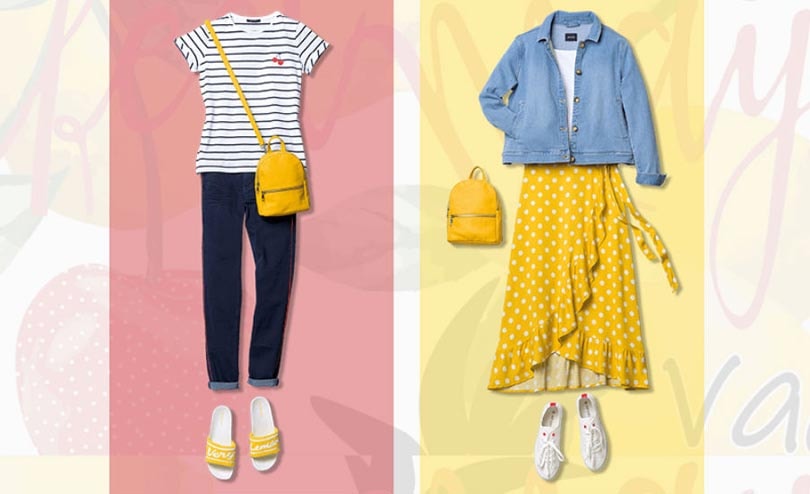 Jede der vier Influencerinnen entwarf ein Outfit, das aus jeweils vier Kleidungsstücke oder Accessoires besteht. Die 16-teilige Kollektion bietet mit einem Jumpsuit, T-Shirt, Top, Maxirock, zwei Jeansjacken, einer Bluse, einer Hose, einer Jeans, Shorts, Sneakers, zwei Paar Pantoletten, und zwei Umhängetaschen beziehungsweise einem Rucksack alltagstaugliche Kleidungsstücke, die sich beliebig kombinieren lassen. ‘Zitronenlook’, ‘Polka Dots’, ‘Maritim’ und ‘Boho-Vibes’ waren die vier Themen, die Tan, Pahde, Motz und Palme in der Kollektion zum Ausdruck gebracht haben.