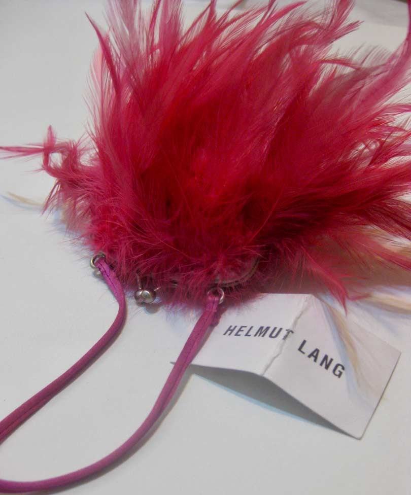 Eine fuchsienfarbene alte Helmut Lang Tasche mit federn hängt an meiner Wand. Sie ist zu klein um auch nur ein iPhone darin zu verstecken. Welch wunderbare Erinnerung daran, dass unser Glauben an die Mode jedes Hindernis überwinden kann!
