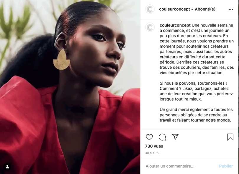 Afrikanische Modeschöpfer, von denen die große Mehrheit selbständig ist, müssen sich mit dieser neuen Situation abfinden. Mehr denn je sind Designer nun bestrebt, ihre Beziehungen zu den Kunden zu stärken. In einem auf Instagram veröffentlichten Beitrag forderte der Concept Store Couleur Concept mit Sitz in Abidjan, Elfenbeinküste, seine Follower auf, lokales Design zu unterstützen: "Heute wollen wir uns einen Moment Zeit nehmen, um unsere Designer zu unterstützen, die in dieser Zeit in Schwierigkeiten sind. Hinter diesen Kollektionen stehen Schneiderinnen, Familien, Leben, die von dieser Situation betroffen sind. Wenn wir können, unterstützen wir sie! Wie können wir sie unterstützen? Zum Beispiel, share diesen Post, kaufe eine ihrer Kreationen, die du tragen wirst, wenn alles besser ist... ", schreibt Couleur Concept.