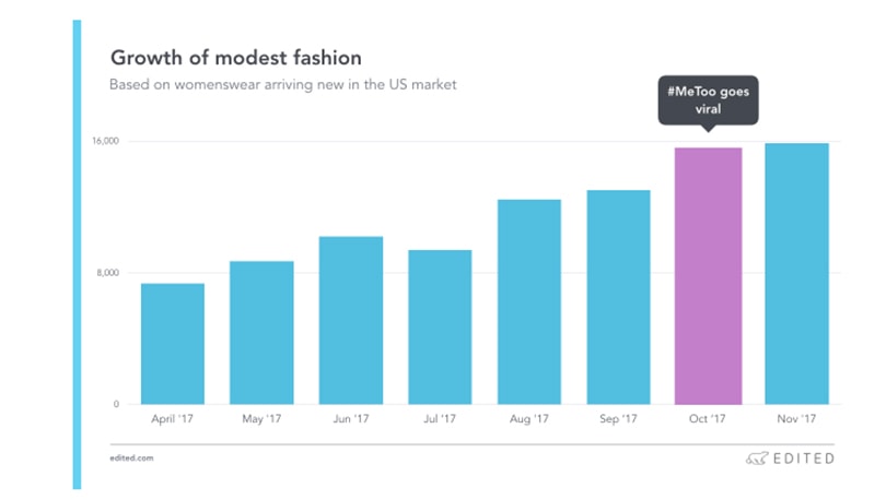 Ein bedeutender Teil dieses Wachstums wird von muslimischen Konsumenten getragen: Ein aktueller Bericht von Thomson Reuters Global prognostiziert, dass die Ausgaben der muslimischen Konsumenten bis 2020 auf 2,6 Billionen Dollar steigen werden, wobei die Mode zu den stärksten Sektoren gehört. Aber nicht nur die Religion ist der Grund, warum die bescheidene Mode auf dem Vormarsch ist. Edited bringt den Zuwachs des Modest Fashion Sortiments der Einzelhändler mit der Bewegung #MeToo in Verbindung.