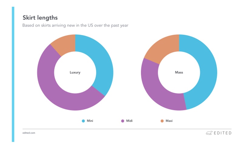 Auch im Luxussegment gehen die Saume zurück: Midi-Röcke machen erstaunliche 53 Prozent des gesamten Rocksortiments aus, wobei Gucci, Marni, Tibi und Jil Sander den Trend anführen. Maxi-Röcke bilden immer noch den kleinsten Prozentsatz des Marktes sowohl in den USA als auch in Großbritannien, aber es gibt Anzeichen dafür, dass einige Verbraucher sie nicht mehr als viel zu verhüllend ansehen: Die Silhouette hat auf dem Luxusmarkt um 67 Prozent und auf dem Massenmarkt um 55 Prozent an Beliebtheit gewonnen.