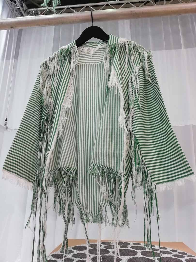 Neben der Präsentation innovativer neuer Materialien zeigte die Ausstellung auch, wie traditionelle Materialien zirkulärer eingesetzt werden können. In ihrem Projekt “Weave (K) not Waste” wollte Sarah Brunnhuber eine minimale Produktionstechnik für Kleidungsstücke schaffen, indem sie Musterformen direkt webt, um Verschnitt zu vermeiden, und indem sie jedes Stück zusammenknüpft, um Nahtabfälle zu vermeiden. Ihr klassisches gestreiftes Hemd betont die geknoteten Kanten, die sich im Zickzack um die Nähte weben und es hängt neben dem ursprünglichen, nicht zugeschnittenen Stoff.