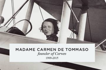 Carven, die eigentlich Carmen de Tommaso hieß und den Namen ihres Modehauses gleich zu ihrem eigenen Pseudonym machte, kreierte zunächst nur Haute Couture, denn Prêt-à-porter gab es damals noch nicht. Dennoch verstand sie ihre Mode nicht als elitär und lehnte auch jeden Starrummel ab, wie ihn z.B. Designerkollegen wie Christian Dior betrieben. Wie sie ihre Mode verstand, zeigte sie schon auf ihrer Einladungskarte zur Eröffnung des ersten Geschäfts 1945: Anstelle von pompösen Abendroben zierte die Karte nur eine verspielte Illustration, die ein junges Mädchen auf einem Fahrrad mit einem Anhänger voller Schneiderutensilien zeigt. Ebenso schlicht und grafisch war auch ihr Markenzeichen, die grün-weißen Blockstreifen.