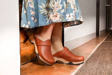 Mit heller Holzsohle aus weichem Nappaleder zählt TAMINA in der Trendfarbe cognac zu den weiteren Must-Have Clogvarianten des Sommers.