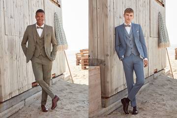 Die Natürlichkeit der Farben und Stoffe unterstreicht die edle und lässige Romantik der Umgebung und passt sich dabei dem Look der Braut an. Die Anzüge aus Naturstoffen wie Leinen oder Baumwolle nehmen das warme beige des Sandes auf. In Kombination mit einem blütenweißen Hemd strahlt der Look mit der Sommersonne um die Wette. Weitere Farbnuancen nehmen sich ein Beispiel an den Weiten des Meeres. Hier erscheinen Anzüge von einem leichten Graublau bis Dunkelblau und wirken in ihrer Silhouette akzentuierter. Belebt wird die Kollektion durch mannigfaltige Mustervariationen. Von feinen Mustern, über Streifen bis hin zu Fensterkaros – alles wirkt harmonisch und entspannt.