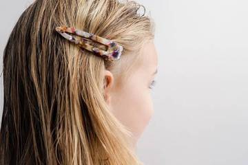 Möchten Sie, dass der Haarschmuck ein wenig auffälliger ist? Dann empfehlen wir die Ivy, Audrey und Sienna Pins. Der Aufdruck in sanften Farben ist bei jeder Anstecknadel einzigartig. (Oben: Acetat - Unten: goldfarbenes Metall mit Zacken).
