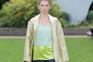 Am Donnerstag zeigten Perret und Schaad ihre neue Kollektion für die Saison Frühjahr/Sommer 2015 im Garten des Kronprinzenpalais, hatten das Glück, das die Sonne am Donnerstagmittag erstmals während dieser Fashion Week verlässlich schien, und sorgten mit ihren auf den ersten Blich schlichten, aber äußerst raffinierten Entwürfen, die sie um neue Elemente wie Prints aus gebrochenen Streifen, Lasercuts und historisch inspirierte Schleifen und Knoten bereichert hatten, für einen Höhepunkt der Mercedes-Benz Fashion Week.